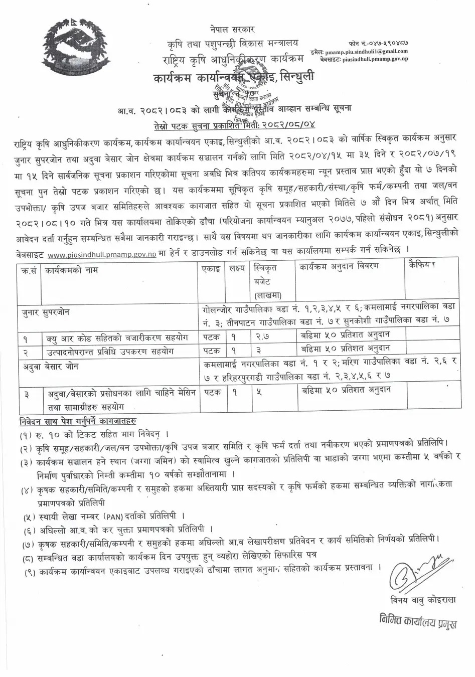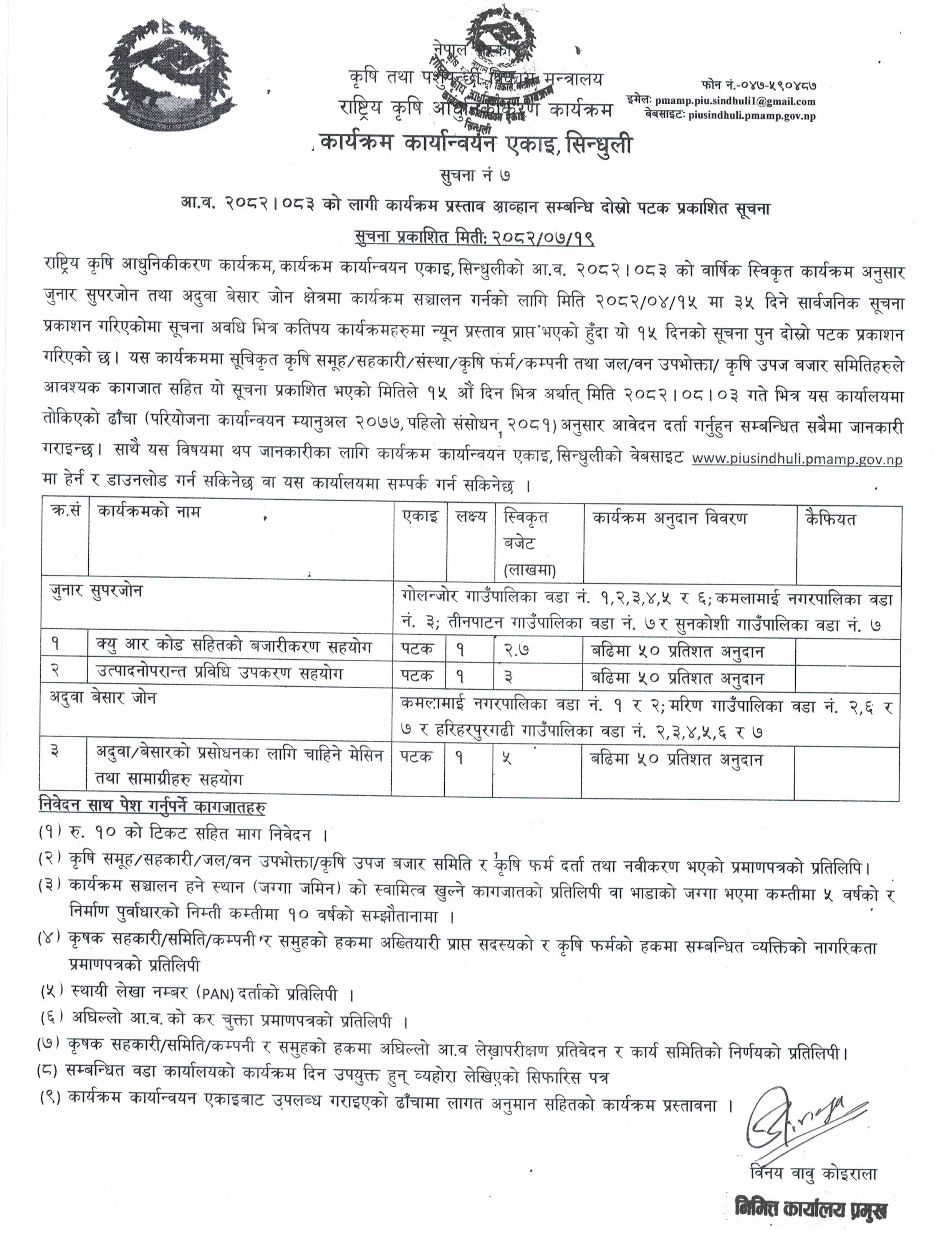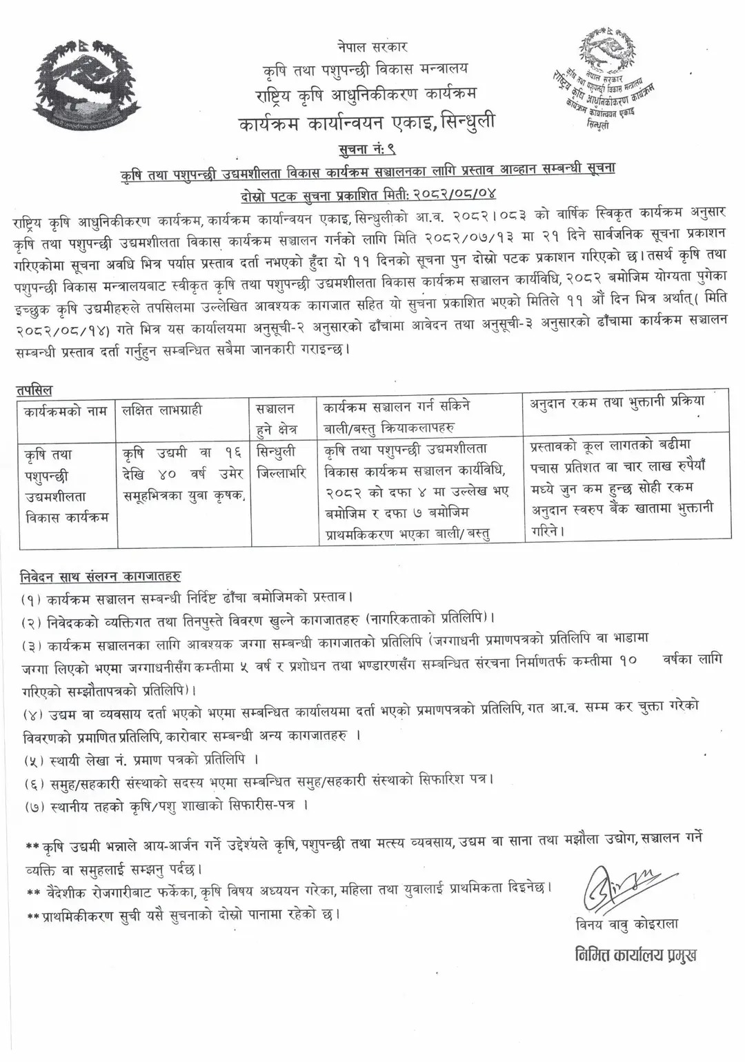 कृषि तथा पशुपन्छी उद्यमशिलता विकास कार्यक्रम सञ्चालनका लागि प्रस्ताव आव्हान सम्बन्धी सुचना २०८२/०८३ 2082-07-13 2082-08-03