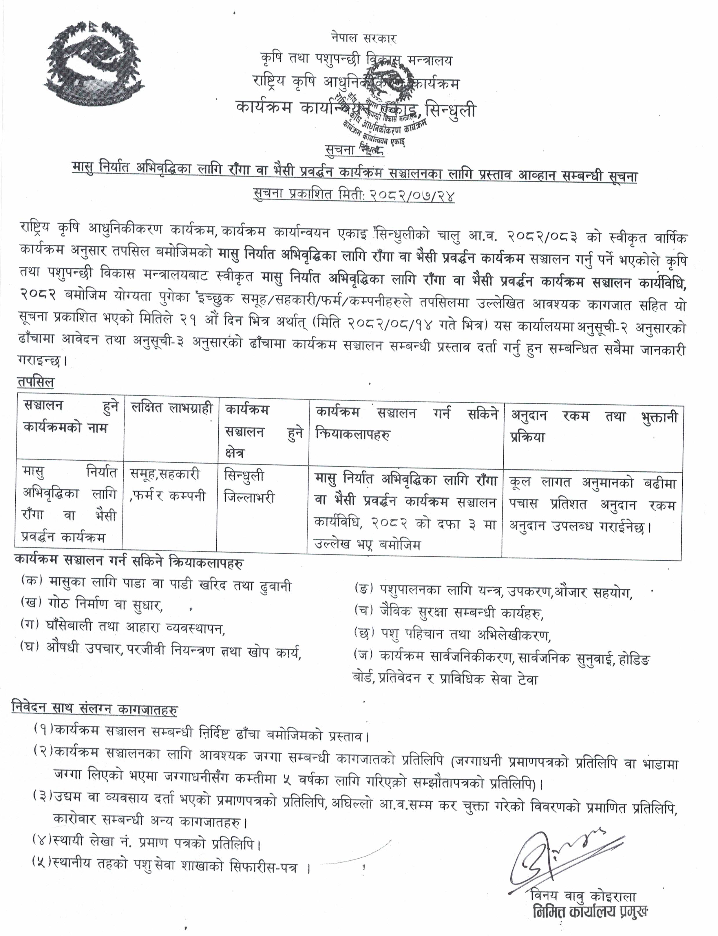 मासु निर्यात अभिवृद्धिका लागि राँगा वा भैसी प्रवर्द्धन कार्यक्रम सञ्चालनका लागि प्रस्ताव आव्हान सम्बन्धी सूचना आ.व. २०८२/०८३ 2082-07-24 2082-08-14