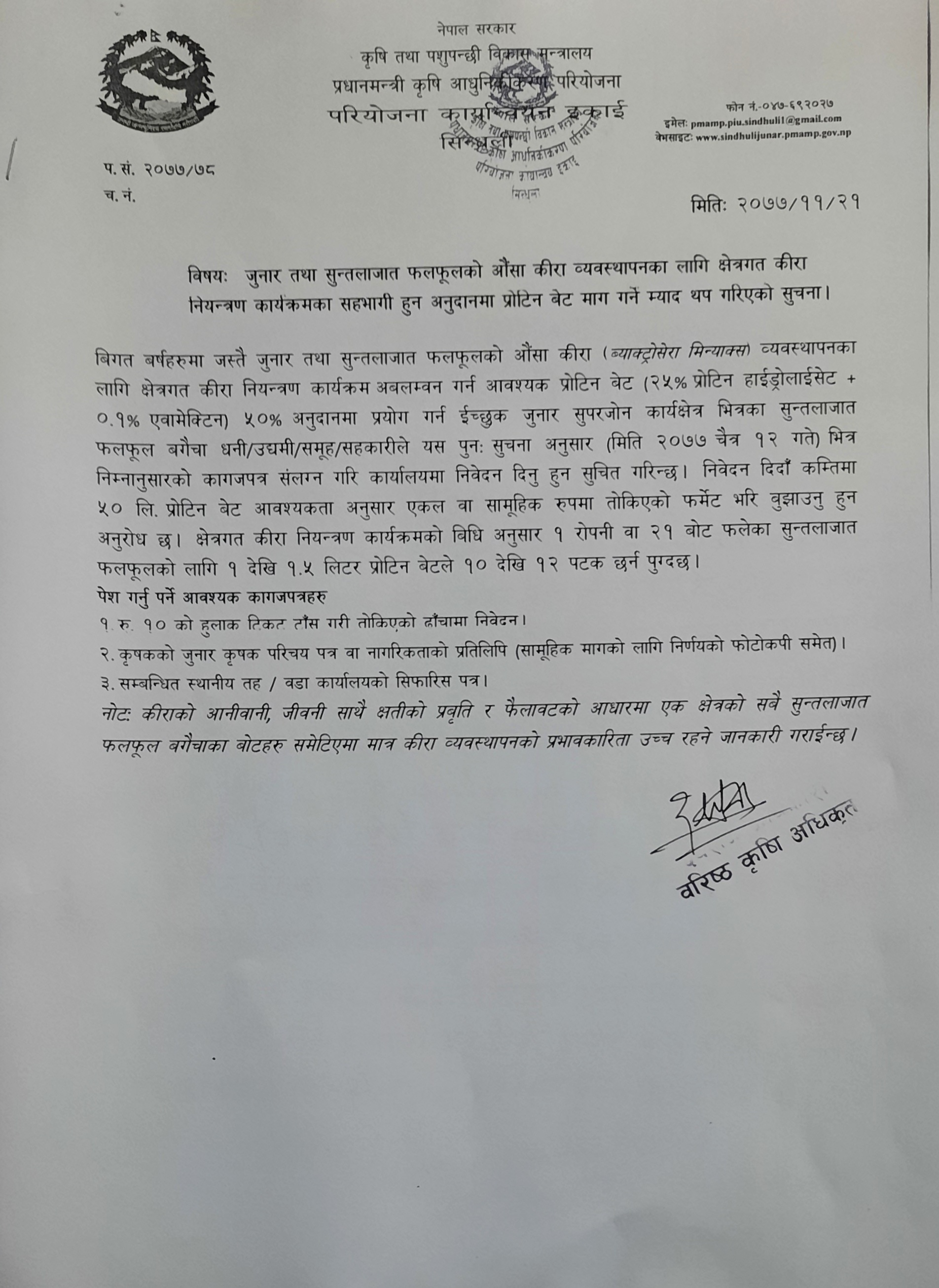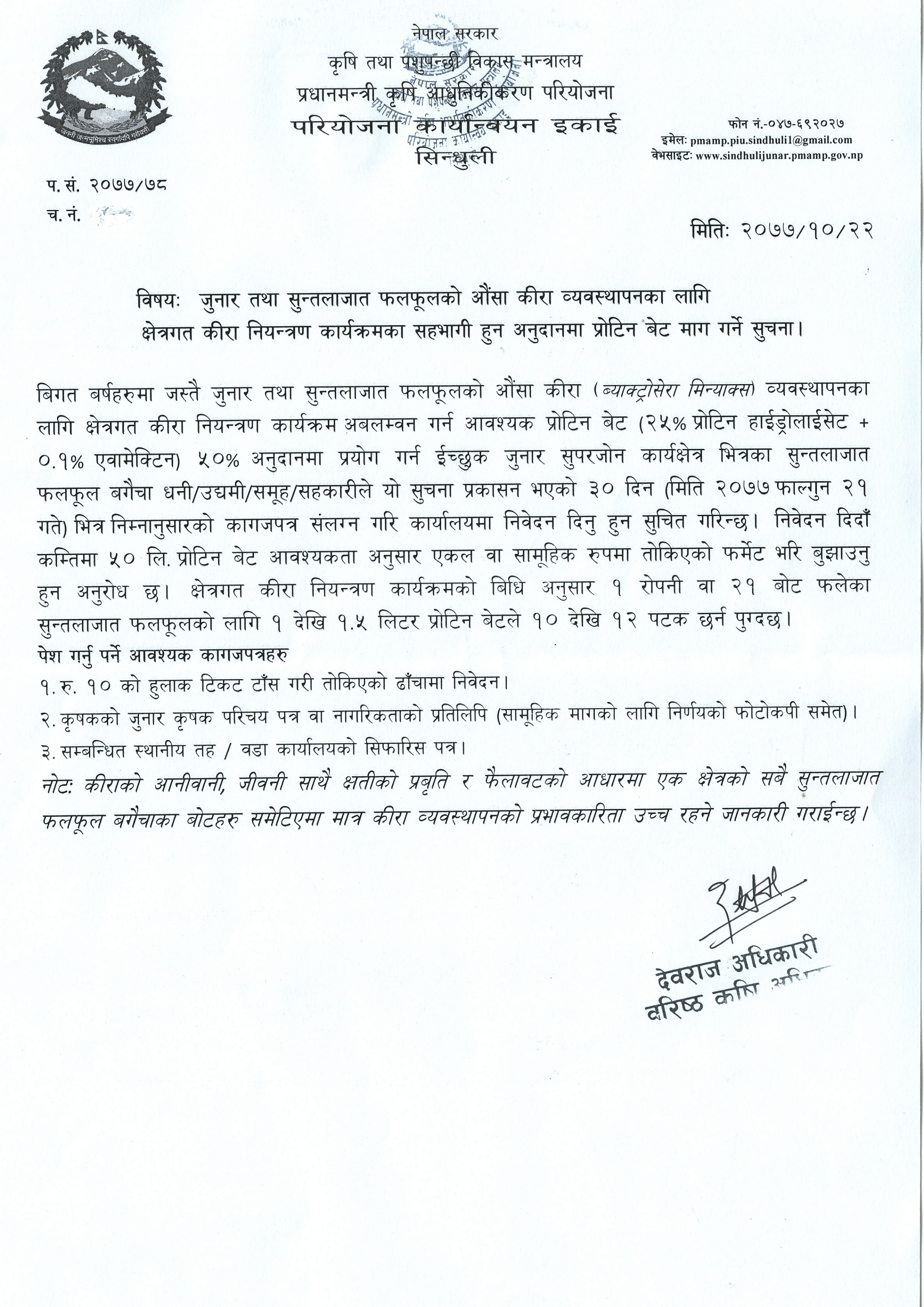 जुनार तथा सुन्तलाजात फलफूलको औंसा कीरा व्यवस्थापनका लागि क्षेत्रगत कीरा नियन्त्रण कार्यक्रमका सहभागी हुन अनुदानमा प्रोटिन बेट माग गर्ने सुचना।