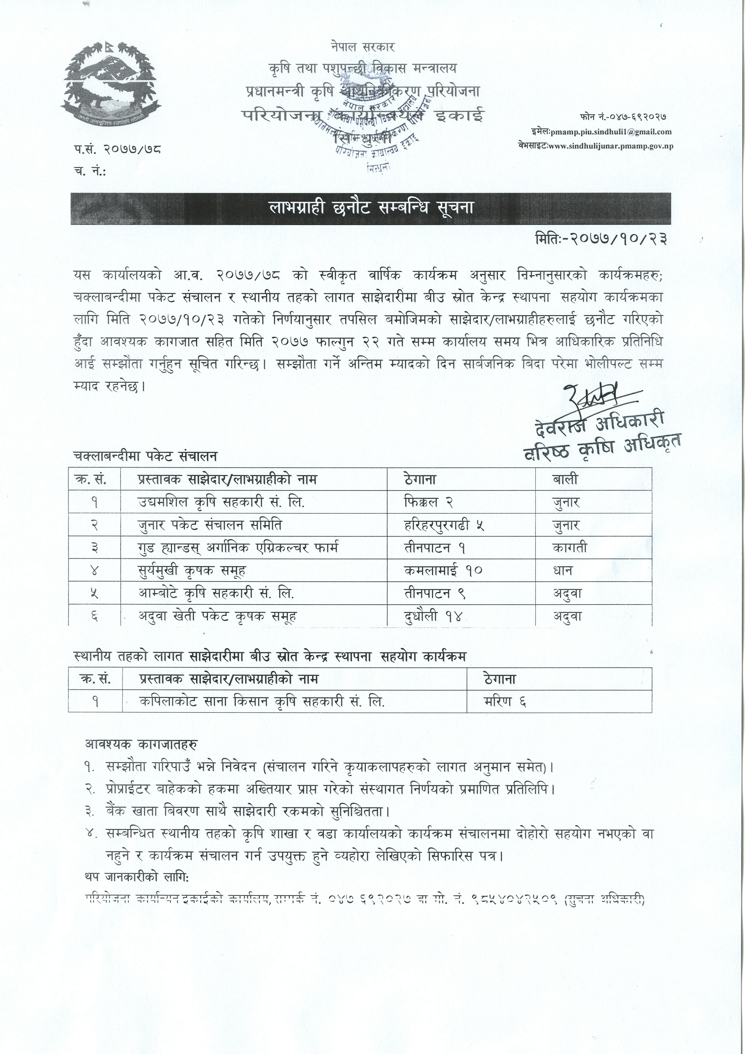 लाभग्राही छनौट सुचना, चक्लाबन्दीमा पकेट र बीउ श्रोत केन्द्र